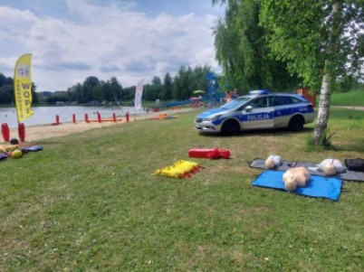 Funkcjonariusze Zespołu ds. Nieletnich i Patologii Wydziału Prewencji KPP w Bochni wspólnie z ratownikami WOPR ze stowarzyszenia „Rescue Team Bochnia” przygotowali szereg informacji i pokazów dla plażujących.