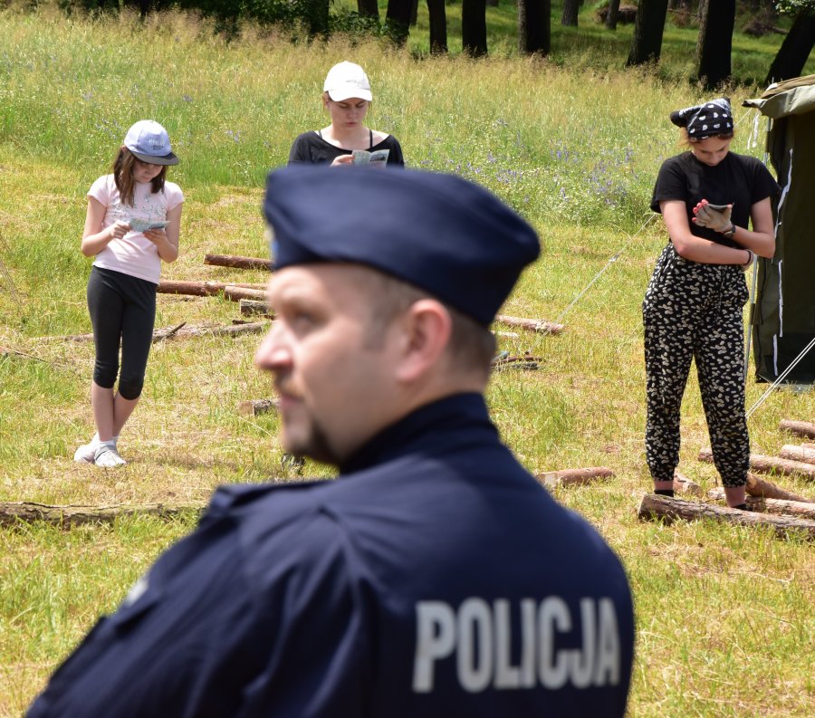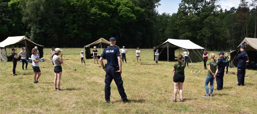 Kontrola obozu harcerskiego przez wielickich policjantów.