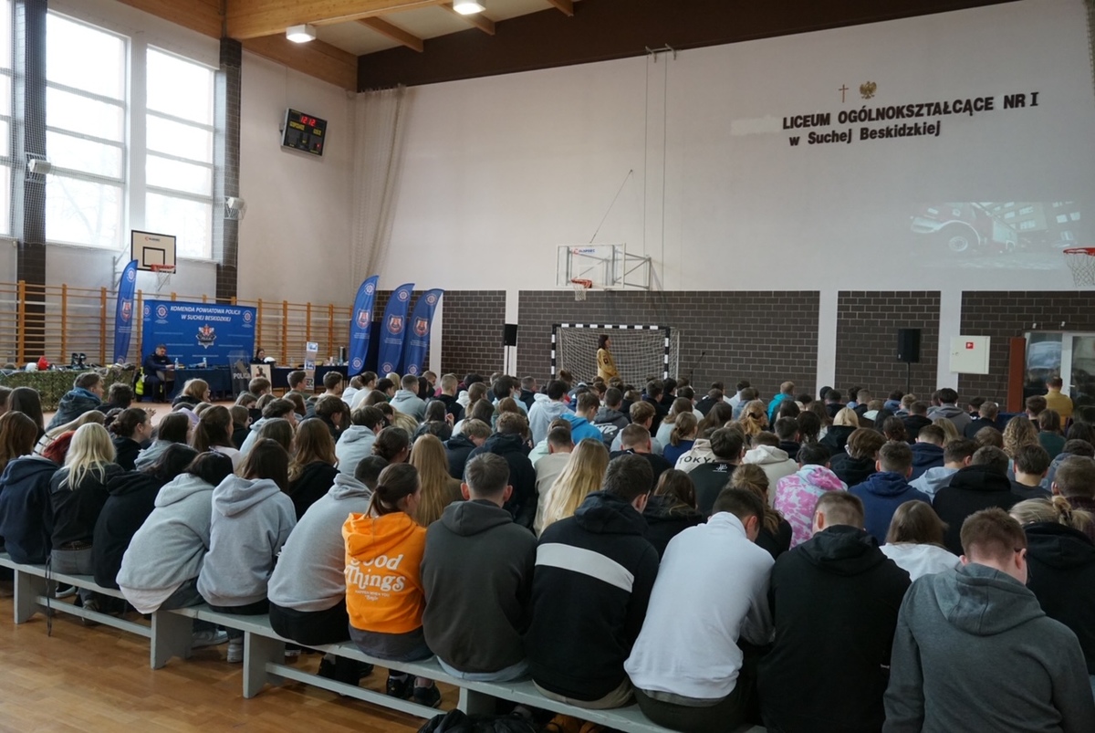 W czwartek (13 lutego br.) na terenie hali sportowej w Liceum Ogólnokształcącego im. Marii Skłodowskiej-Curie w Suchej Beskidzkiej odbyło się drugie spotkanie pn. „Promocja Zawodów Mundurowych w Powiecie Suskim 2025”, które zostało zorganizowane przez Komendę Powiatową Policji w Suchej Beskidzkiej oraz Starostwo Powiatowe w Suchej Beskidzkiej dla tegorocznych maturzystów. Inaugurację wydarzenia w Suchej Beskidzkiej rozpoczęli powitaniem Dyrektor Szkoły Pani mgr Anna Sala oraz I Zastępca Komendanta Powiatowego Policji w Suchej Beskidzkiej nadkom. Sebastian Barcik i Komendant Powiatowy Państwowej Straży Pożarnej w Suchej Beskidzkiej st.bryg. Krzysztof Okrzesik.
