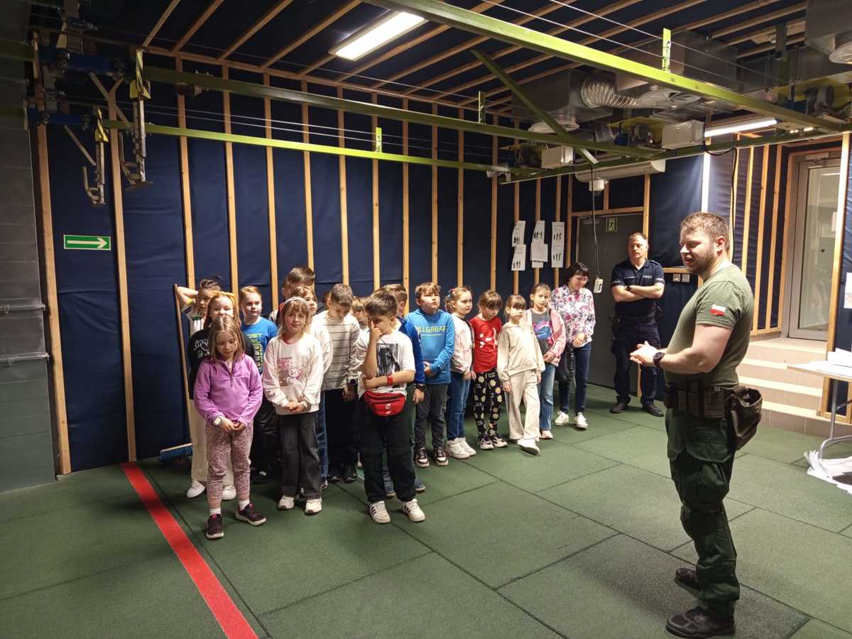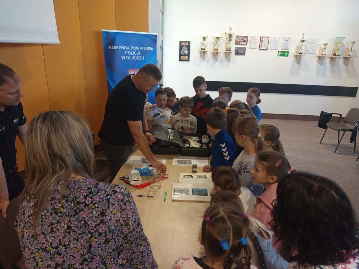 Dzieci wizytę rozpoczęły od pokazu sprzętu i wyposażenia jakie wykorzystują w codziennej służbie dzielnicowi. Mundurowi opowiadali o swoim doświadczeniu i codziennych zadaniach. Następnie technik kryminalistyki zaprezentował walizkę daktyloskopijną. Zainteresowani mieli możliwość sprawdzić praktyczne zastosowanie środków służących zabezpieczaniu linii papilarnych. Drugoklasistów zapoznano również z różnego rodzaju śladami. Podczas wycieczki dzieci zwiedziały strzelnicę, na której policjanci podnoszą umiejętności strzeleckie, a o specyfice przeprowadzanych ćwiczeń strzeleckich w Komendzie Powiatowej Policji w Olkuszu opowiadał instruktor wyszkolenia strzeleckiego. Na koniec chętni mogli usiąść za kierownicą policyjnego radiowozu. Wizyta w jednostce sprawiła uczniom wiele radości. Nie odbyło się bez pytań, co świadczyło o zainteresowaniu uczniów.