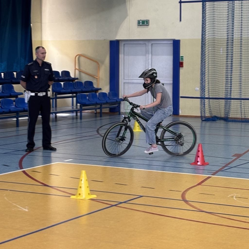 Egzamin odbywał się na torze manewrowym rozstawionym na hali sportowej. Uczniowie musieli wykazać się nie tylko umiejętnością płynnej jazdy, ale także koordynacją ruchową, utrzymywaniem równowagi, prawidłowym sygnalizowaniem manewrów oraz znajomością znaków drogowych. Policjant wspierał nauczycieli w ocenie przejazdów i dbał o to, by dzieci miały świadomość odpowiedzialności wynikającej z poruszania się po drogach publicznych.