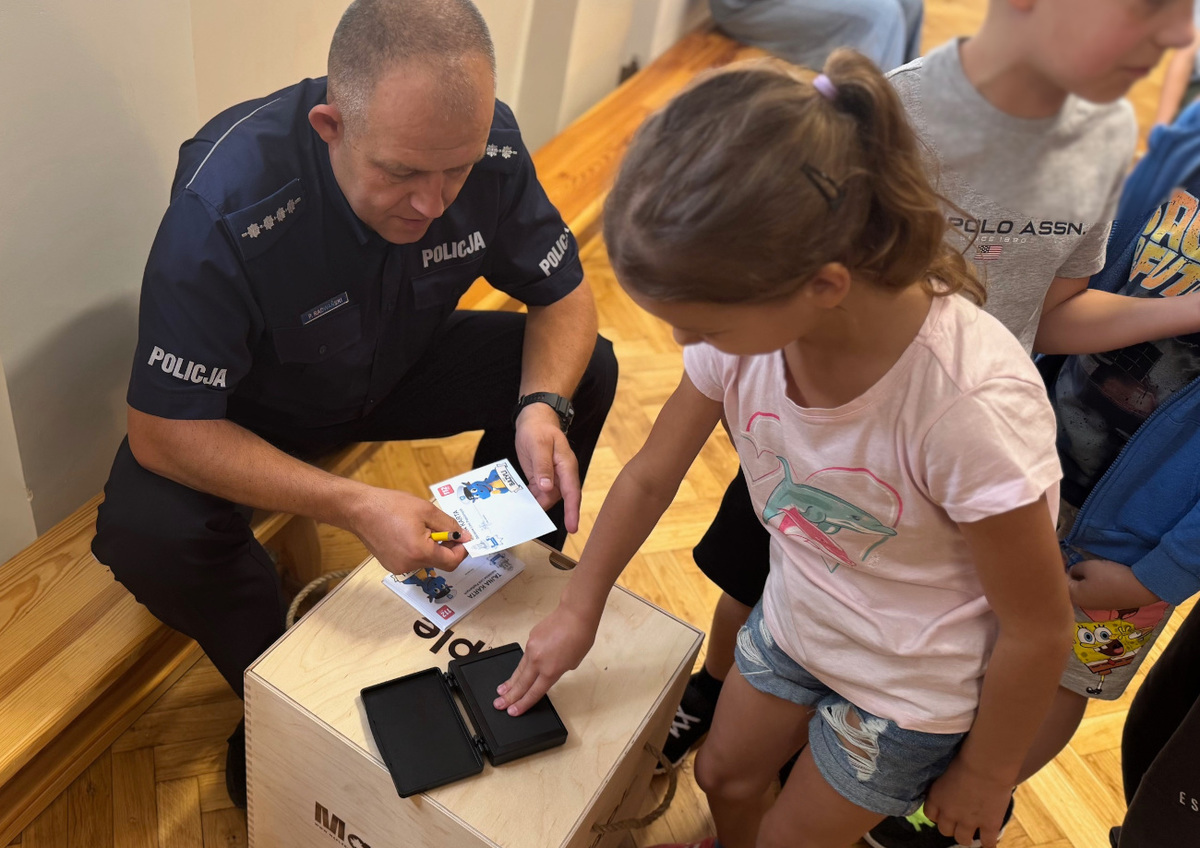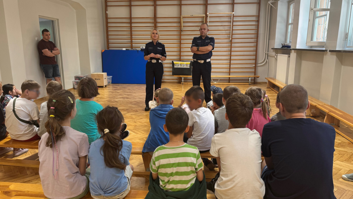 Podczas wizyty policjanci przypomnieli dzieciom najważniejsze zasady bezpieczeństwa obowiązujące podczas wakacji, zarówno w ruchu drogowym, jak i w trakcie zabawy w domu, nad wodą czy w górach. Uczestnicy mieli okazję dowiedzieć się, jak prawidłowo poruszać się po drodze, jak zachować się w sytuacjach niebezpiecznych oraz dlaczego warto nosić elementy odblaskowe. Policjanci opowiadali o służbie w ruchu drogowym i wyzwaniach, z którymi mierzą się każdego dnia oraz swojej roli w zapewnianiu bezpieczeństwa wszystkim uczestnikom ruchu. Omówione zostało również znaczenie numeru alarmowego 112 z jednoczesnym wyjaśnieniem w jakich sytuacjach należy z niego korzystać i jakie informacje przekazywać, by uzyskać szybką pomoc. Spotkanie odbyło się w przyjaznej atmosferze i z pewnością na długo pozostanie w pamięci uczniów. Było to nie tylko ciekawe wydarzenie, ale przede wszystkim cenna lekcja odpowiedzialności i troski o własne oraz cudze bezpieczeństwo. Mundurowi zachęcali dzieci do wzięcia udziału w konkursie pod nazwą „LETNI przeWODNIK” i stworzenia oraz wysyłania swoich prac plastycznych lub spotów promujących bezpieczeństwo podczas wakacji.