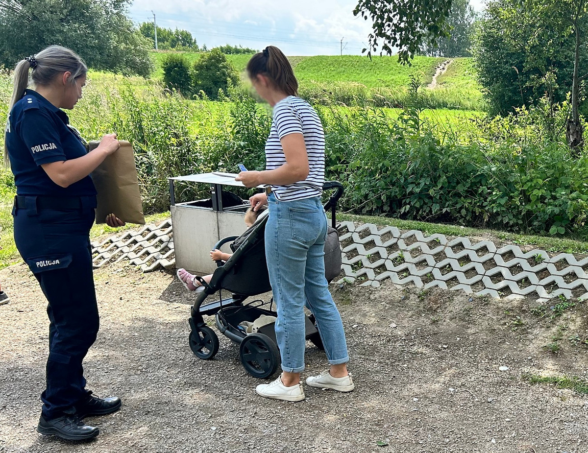 Napotkane dzieci, policjantki zachęcały do wzięcia udziału w konkursie pod nazwą „LETNI przeWODNIK” współorganizowanym przez Komendę Główną Policji.