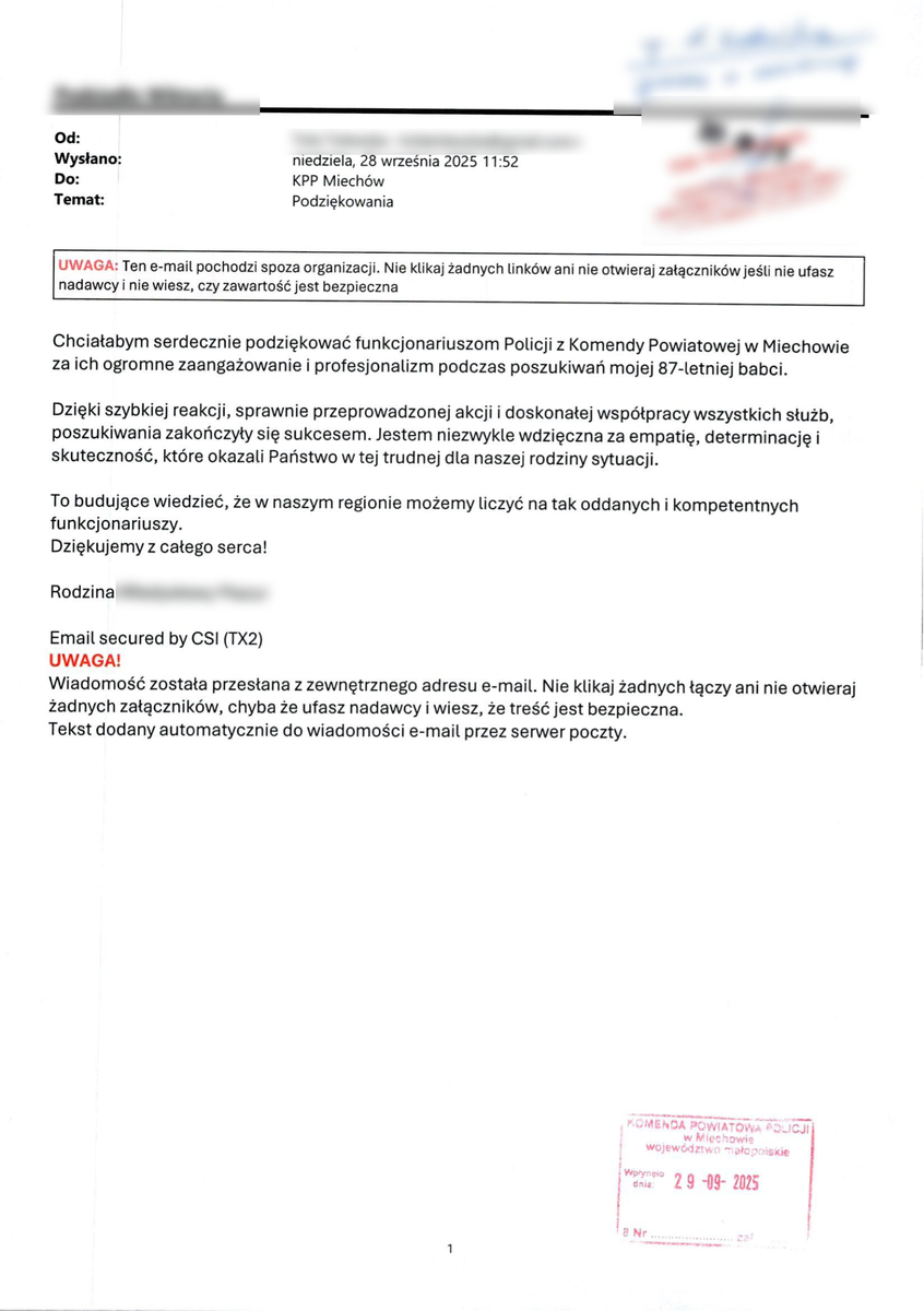 Dziękujemy każdemu, kto wziął udział w poszukiwaniu 87-letniej mieszkanki Kępia za obecność, pomoc, czas i ogromne zaangażowanie. Po akcji poszukiwawczej wpłynęły również podziękowania od rodziny zaginionej.
