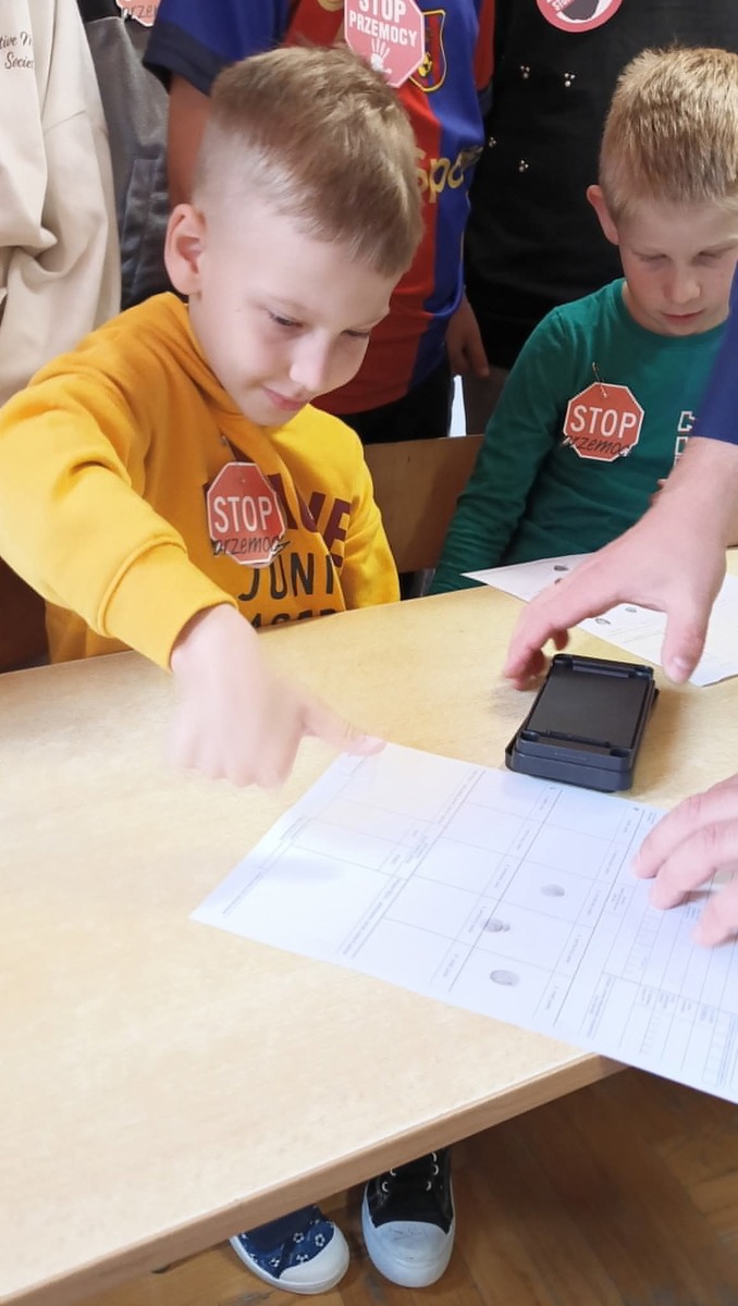 Podczas spotkań z mundurowymi uczniowie mieli możliwość przymierzenia policyjnego sprzętu oraz wzięcia udziału w pokazie zbierania odcisków palców.