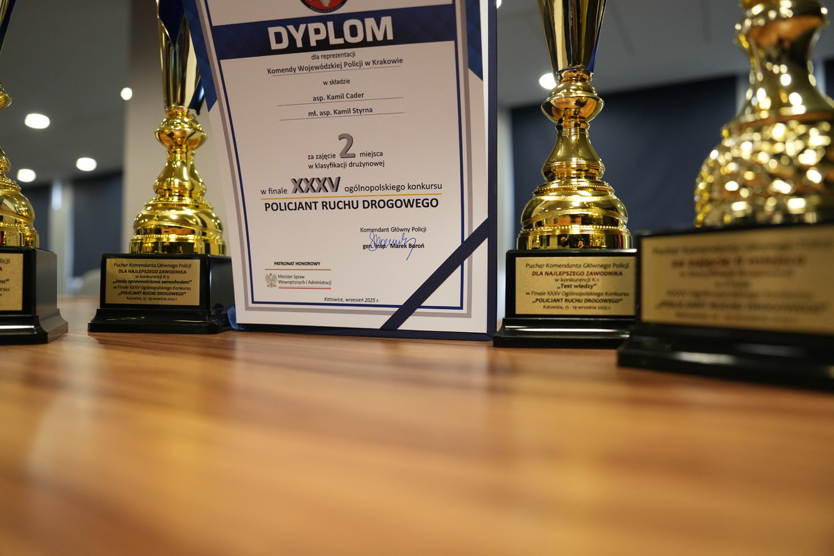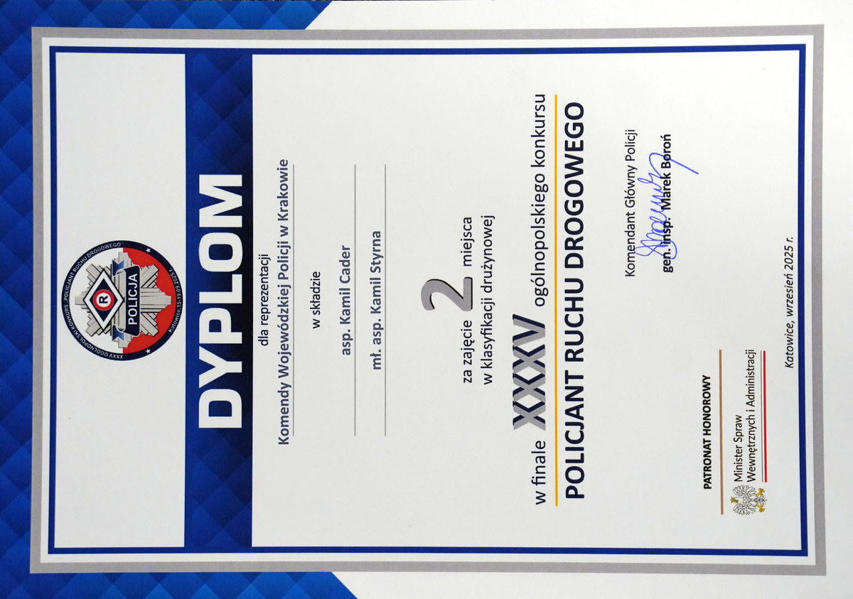 1. Finał XXXV Ogólnopolskiego Konkursu „Policjant Ruchu Drogowego" zakończył się 19 września br. w Katowicach. W ciągu trzech dni policjanci ruchu drogowego z całej Polski rywalizowali w konkurencjach dotyczących wiedzy, umiejętności i sprawności o miano najlepszego funkcjonariusza ruchu drogowego w Polsce.Mł. asp. Kamil Styrna zajął pierwsze miejsce w teście znajomości przepisów, natomiast asp. Kamil Cader zajął pierwsze miejsce w dwóch konkurencjach: jeździe sprawnościowej motocyklem oraz jeździe sprawnościowej samochodem służbowym. Obydwaj reprezentowali w zawodach Komendę Wojewódzką Policji w Krakowie.