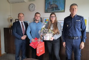 Pan Łukasz oraz Pan Wacław, który nie mógł wziąć udziału w spotkaniu, jako osoby cywilne, wspólnie z policjantami i strażakami, ratowali życie pary seniorów, znajdujących się w płonącym domu. Spotkanie odbyło się wczoraj (30.10.2025) w Urzędzie Gminy Oświęcim. W swoich przemówieniach Komendant oraz Wójt, podziękowali panom Łukaszowi oraz panu Wacławowi, za błyskawiczną reakcję i ratowanie życia mieszkańcom gminy Oświęcim, działając z narażeniem życia własnego. Życzyli im sukcesów zawodowych oraz szczęścia i pomyślności w życiu osobistym. Oprócz listów gratulacyjnych od Komendanta oraz Wójta pan Łukasz oraz towarzysząca mu narzeczona pani Katarzyna, odebrali upominek ufundowany przez Gminę Oświęcim. Upominek i listy gratulacyjne do Pana Wacława, nieobecnego na spotkaniu, zostaną dostarczone do jego miejsca zamieszkania.