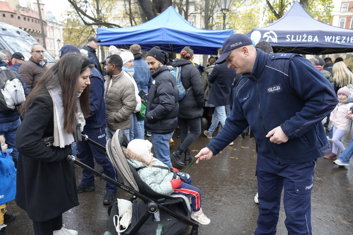 Funkcjonariusze nie tylko brali czynny udział w uroczystościach, ale także dbali o porządek i bezpieczeństwo, kierowali ruchem drogowym oraz współtworzyli miasteczko służb mundurowych nieopodal Barbakanu. Swoje stoiska mieli: Wydział Ruchu Drogowego, Wydział Prewencji, Wydział Doboru i Szkolenia oraz Laboratorium Kryminalistyczne KWP w Krakowie. Stoiska te cieszyły się bardzo dużym zainteresowaniem.