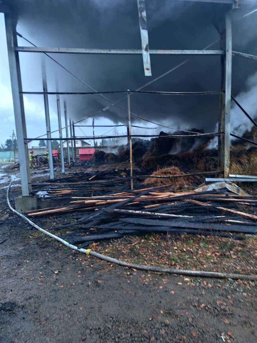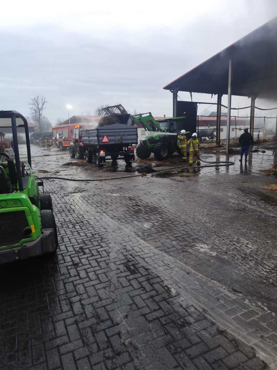 Zniszczeniu uległ budynek gospodarczy pełen siana i słomy. Jak ustalono były to zapasy na zimę dla 100 koni. W budynku objętym pożarem znajdował się także sprzęt rolniczy. Właściciele oszacowali straty na blisko 2,5 miliona złotych. Budynek gospodarczy został w całości objęty ogniem. Akcja gaśnicza była trudna i trwała wiele godzin. Pożaru długo nie udawało się opanować. Na miejscu działało kilkanaście jednostek strażackich OSP i JRG. Na czas działań strażackich powstały utrudnienia w ruchu. W działania zaangażowani byli również policjanci.