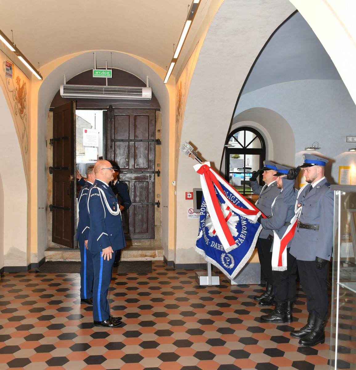 W czwartek (20.11 br.) o godzinie 14:30 w Ośrodku Spotkania Kultur w Dąbrowie Tarnowskiej miała miejsce uroczysta zbiórka związana z objęciem obowiązków służbowych na stanowisku Komendanta Powiatowego Policji w Dąbrowie Tarnowskiej. W uroczystości udział wzięli m.in. Zastępca Komendanta Wojewódzkiego Policji w Krakowie insp. Paweł Krauz, Starosta Dąbrowski Lesław Wieczorek, Burmistrz Dąbrowy Tarnowskiej Krzysztof Kaczmarski, przedstawiciele władz samorządowych, kadra kierownicza, funkcjonariusze i pracownicy jednostki oraz zaproszeni goście. Uroczystość zgodnie z policyjnym ceremoniałem rozpoczęła się złożeniem meldunku Zastępcy Komendanta Wojewódzkiego Policji w Krakowie przez dowódcę uroczystości kom. Pawła Kmiecia. W dalszej części zbiórki miało miejsce odczytanie rozkazu personalnego oraz ceremonia przywitania ze sztandarem Komendy Powiatowej Policji w Dąbrowie Tarnowskiej przez podinsp. Roberta Michałka.