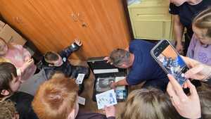 Następnie technik kryminalistyki opowiedział o zadaniach policjantów pionu kryminalnego, a także na czym polega jego służba. Zaprezentował specjalistyczną walizkę, którą każdy technik kryminalistyki zabiera na miejsce zdarzenia. Pokazał w jaki sposób zabezpiecza się różne rodzaje śladów pozostawionych przez sprawcę przestępstwa. Zaprezentował zbieranie odcisków palców pozostawionych na różnych przedmiotach, a także pokazał w jaki sposób skanuje się odciski palców oraz jak wykonuje się fotografię zatrzymanym przestępcom.