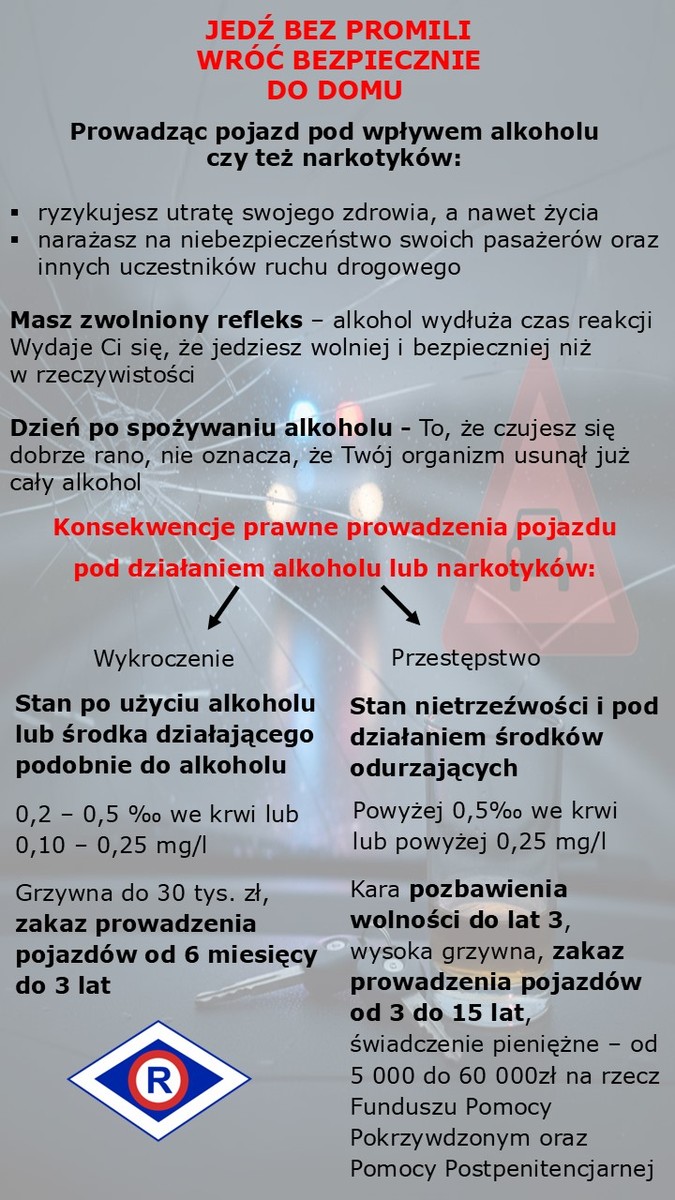 Chcąc zwrócić uwagę kierującym na niebezpieczne zjawisko jakim jest prowadzenie pojazdu pod działaniem niedopuszczalnych substancji, podczas działań prowadzona była również akcja profilaktyczno-edukacyjna. Policjanci wręczali kontrolowanym, specjalnie przygotowane ulotki zawierające informacje na temat bezpiecznego podróżowania „bez promili”. Wato podkreślić, że kierujący prowadzący pojazd pod wypływem alkoholu, czy też narkotyków stanowią potencjalne zagrożenie na drodze. Substancje te spowalniają reakcję oraz powodują błędną ocenę odległości i prędkości.