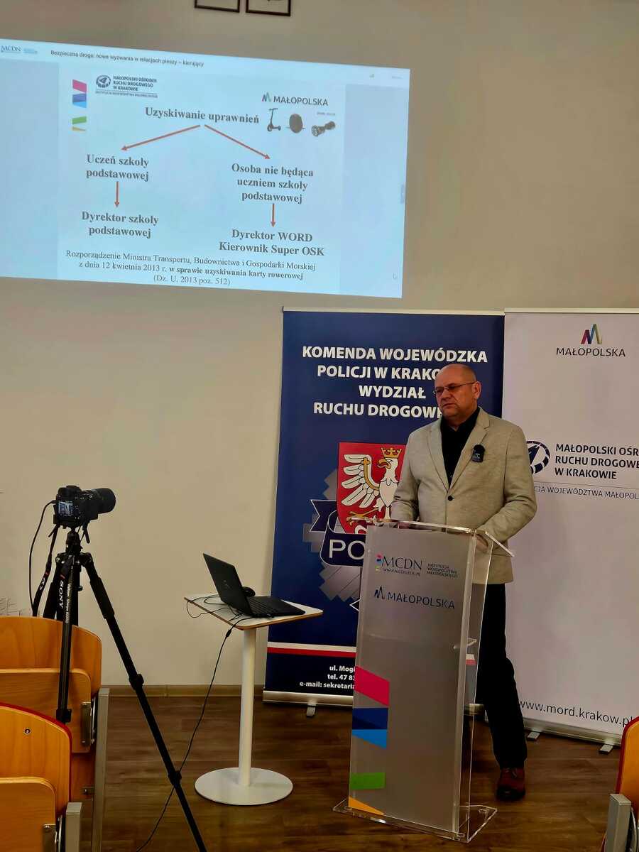 W czwartek 9 kwietnia br., w Krakowie odbyła się konferencja „Nowe wyzwania w relacjach pieszy – kierujący ze szczególnym uwzględnieniem mikromobilności”. Było to kolejne cykliczne spotkanie dotyczące bezpieczeństwa uczniów na drodze. Jej adresatami byli dyrektorzy i nauczyciele z małopolskich szkół podstawowych. Przedsięwzięcie to zorganizowane zostało przez Małopolskie Centrum Doskonalenia Nauczycieli w Krakowie, Małopolski Ośrodek Ruchu Drogowego w Krakowie, Małopolską Wojewódzką Radę Bezpieczeństwa Ruchu Drogowego oraz Wydział Ruchu Drogowego Komendy Wojewódzkiej Policji w Krakowie.