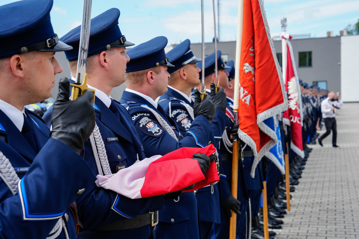 Uroczystość na placu apelowym Oddziału Prewencji Policji w Krakowie rozpoczęła się od złożenia meldunku Komendantowi Wojewódzkiemu Policji w Krakowie inspektorowi Arturowi Bednarkowi przez dowódcę uroczystości kom. Rafała Tobołę, po czym zebrani odśpiewali hymn państwowy i została wciągnięta flaga państwowa.