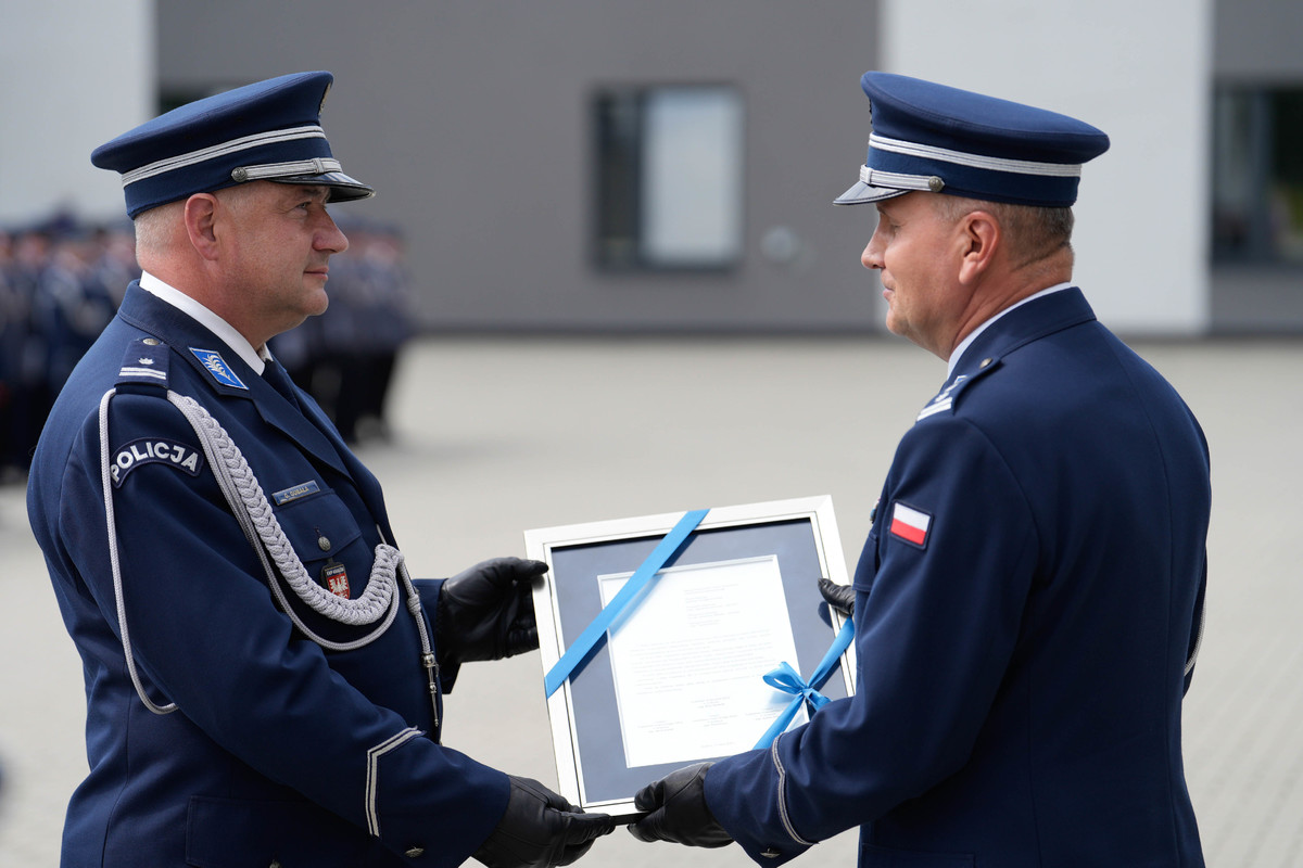 Inspektor Jarosław Nowak Dowódca Oddziału Prewencji Policji w Krakowie podziękował funkcjonariuszom za duże zaangażowanie w realizację zadań służbowych, Pogratulował również wszystkim zgromadzonym na dzisiejszej uroczystości odznaczonym, awansowanym oraz mianowanym.