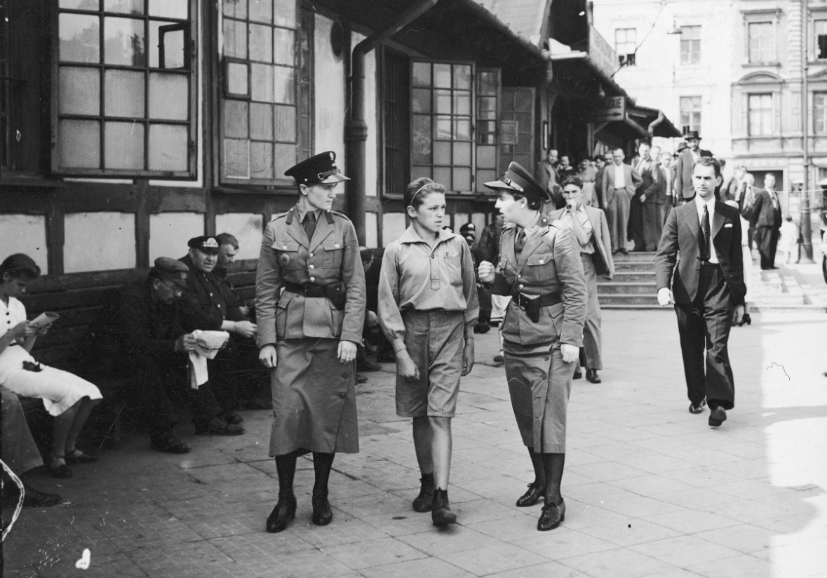 Policjantki z chłopcem w drodze do izby zatrzymań, 1939 r., Referat Policji Kobiecej Centrali Służby Śledczej w Warszawie (Narodowe Archiwum Cyfrowe) -