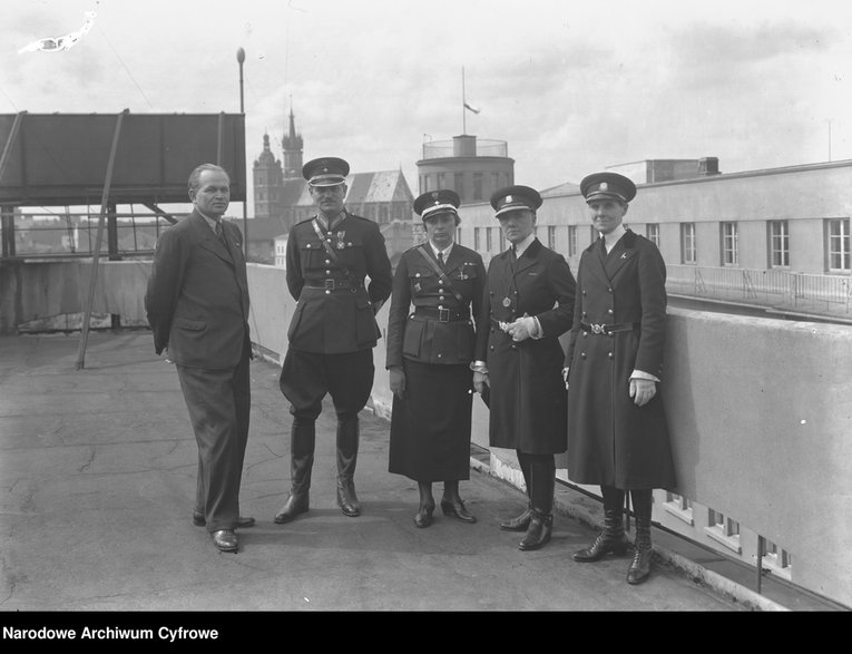 Wizyta angielskich policjantek w Krakowie, zdjęcie wykonano na dachu Pałacu Prasy: komendantka angielskiej policji kobiecej Mary Allen (druga z prawej), insp. Taggart (pierwsza z prawej) oraz kom. Stanisława Paleolog (trzecia z prawej) (Narodowe Archiwum Cyfrowe) -