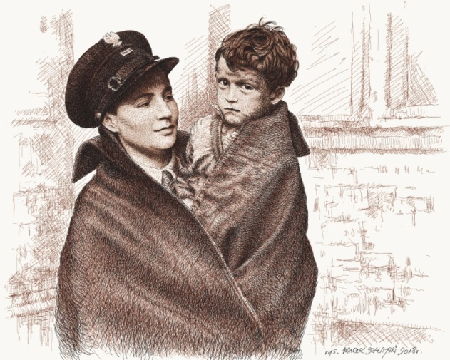 Policjantka z izby zatrzymań z dzieckiem na ręku, 1939 r., Referat Policji Kobiecej Centrali Służby Śledczej w Warszawie, rysunek wykonano w 2018 r. (Autor rysunku: Marek Szałajski)