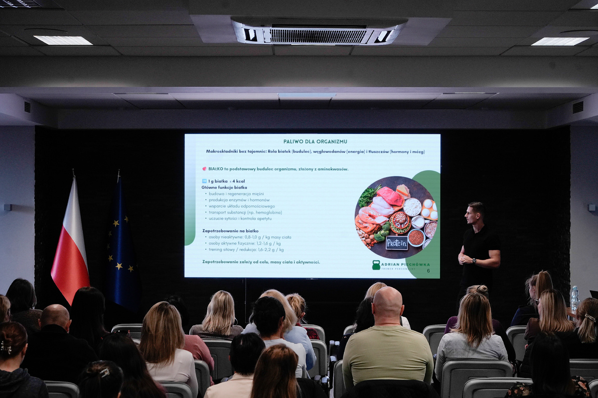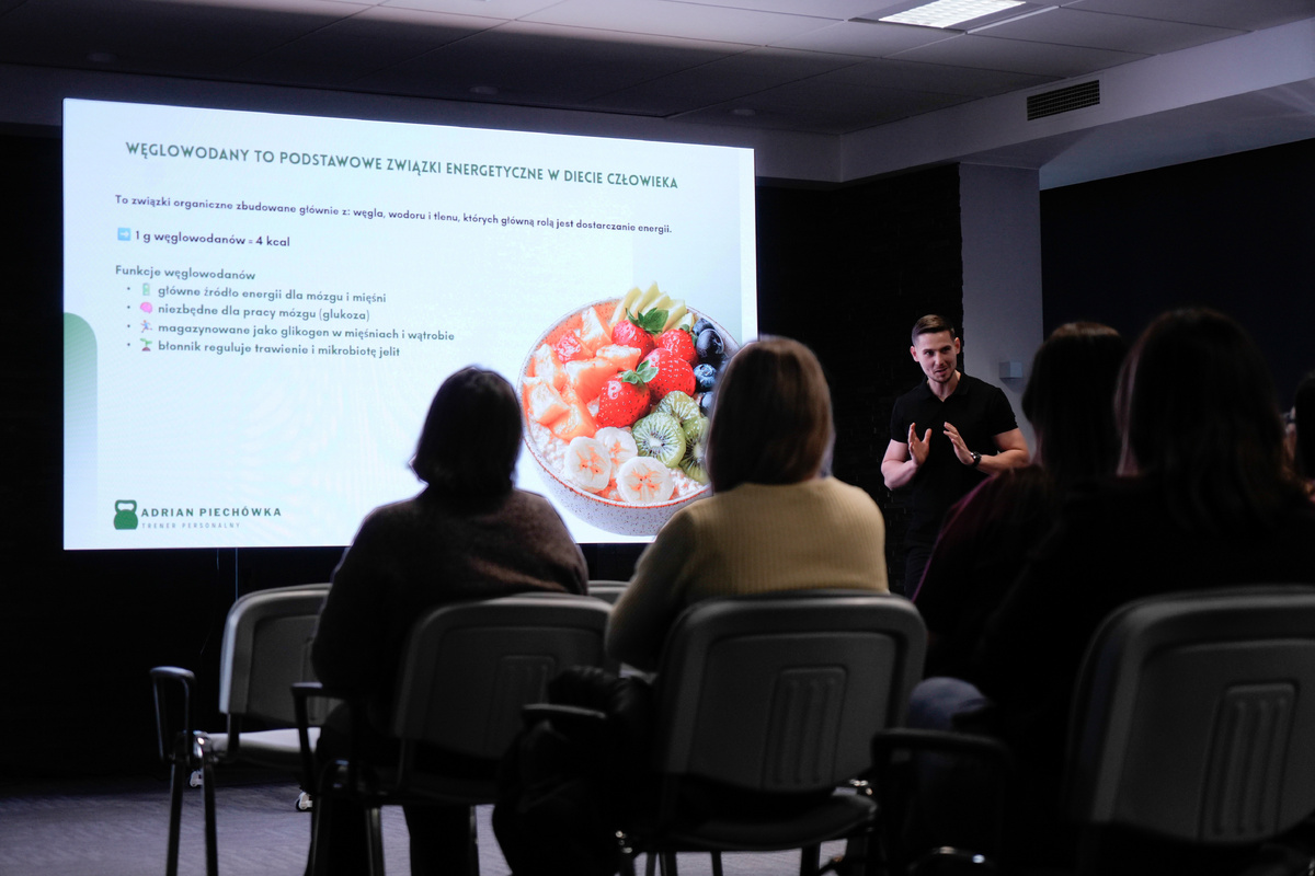 W programie znalazło się m.in. się omówienie zasad zdrowego odżywiania oraz praktyczne wskazówki dotyczące budowania nawyków sprzyjających utrzymaniu dobrej kondycji na co dzień. Uczestnicy wzięli udział w części ,,Makroskładniki bez tajemnic’’, poznali sposoby ,,Liczenia kalorii w 5 minut’’, a także przyjrzeli się ,,Mitowi spadającego metabolizmu’’, w ramach którego poznali wpływ ruchu na długowieczność oraz znaczenie aktywności fizycznej w profilaktyce nadwagi otyłości. Nie zabrakło również konkretnych podpowiedzi, jak komponować posiłek, aby był zbilansowany, sycący i dopasowany do indywidualnych potrzeb. Spotkanie zakończył pomiar składu ciała pozwalający ocenić proporcję miedzy tkanką tłuszczową a mięśniową oraz ogólną kondycję organizmu.