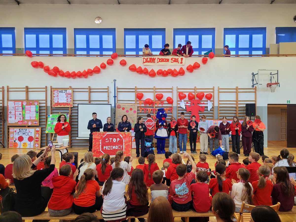 W związku, z czym symbolicznie podczas akcji w trakcie spotkania wszystkich klas na sali gimnastycznej - na znak jedności z małoletnimi ofiarami przemocy - rozbłysło czerwone światło. Ponadto uczniowie tego dnia ubrani byli na czerwono. Przygotowali pokaz filmu o tematyce przemocy rówieśniczej. Zaangażowani byli w stworzenie plakatów i banerów promujących kampanię. Policjanci zgodnie z założeniami kampanii omówili tematykę przemocy, jak ją rozpoznać i jej przeciwdziałać oraz do kogo zwrócić się o pomoc w razie potrzeby. Zwrócono uwagę, iż relacje rówieśnicze wymagają wzajemnego szacunku i tolerancji, nie ma miejsca na przemoc, hejt i nierówne traktowanie. Przypomniano o numerze alarmowym 112 oraz innych ważnych numerach pomocowych dla dzieci i młodzieży w sytuacjach kryzysowych. Policjanci nauczyli uczniów międzynarodowego znaku „POMÓŻ MI”, będącego dyskretnym sygnałem informującym, że jesteśmy ofiarą przemocy. Wystarczy pokazać otwartą dłoń, następnie złożyć dłoń w pięść chowając kciuk do środka.