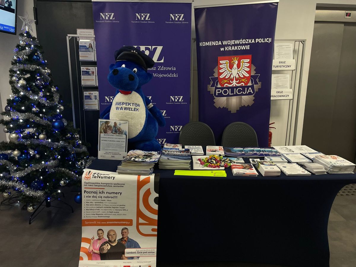 W dniu 9 grudnia br. w Małopolskim Oddziale Narodowego Funduszu Zdrowia przy ul. Wadowickiej w Krakowie policjantka Wydziału Prewencji KWP w Krakowie wraz z Dzielnicową Komisariatu Policji V w Krakowie oraz z pracownikami NFZ przeprowadziły akcję informacyjno-edukacyjną pn. „Bezpiecznie i zdrowo”.