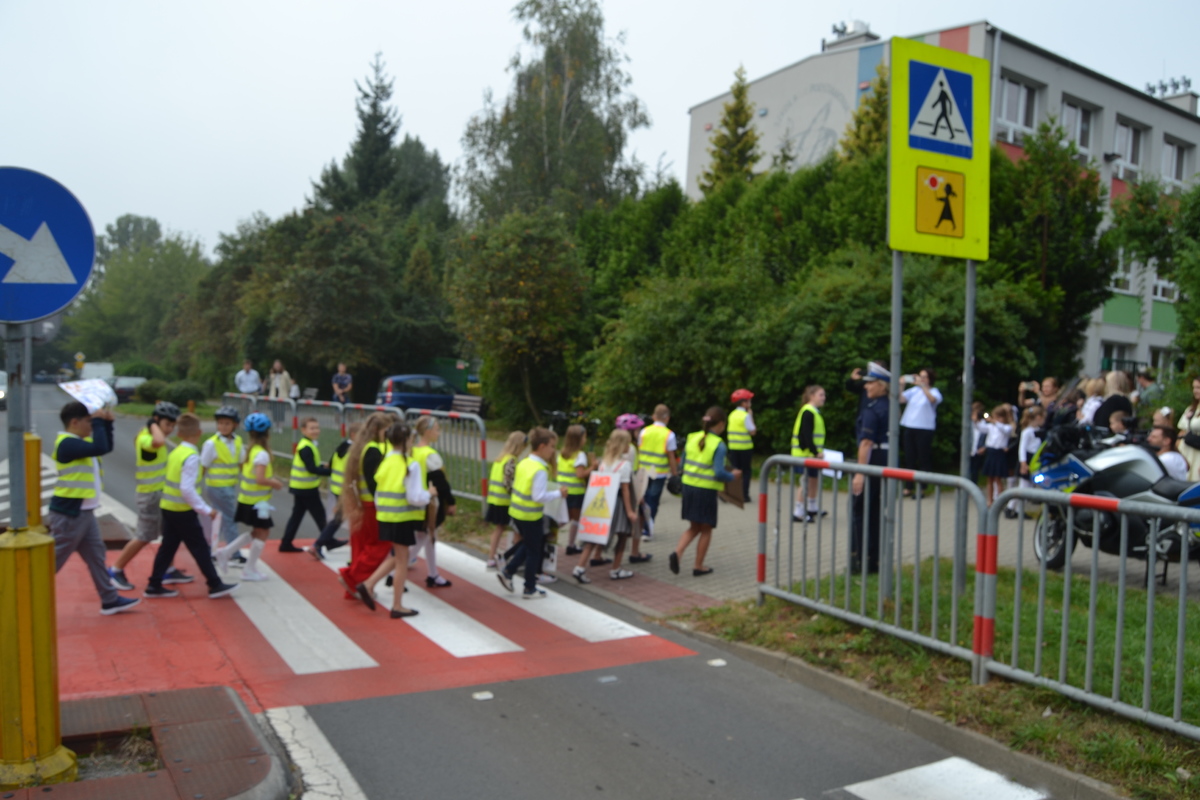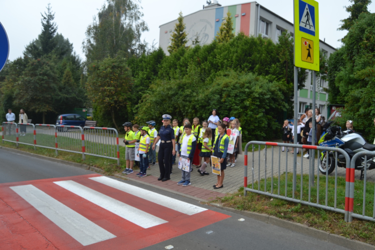 Obecni przy szkole policjanci ruchu drogowego, reagowali na wykroczenia, zwłaszcza dotyczące przekraczania prędkości w rejonie przejścia dla pieszych.