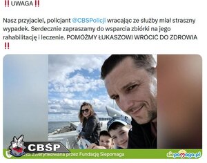 Nasz przyjaciel, policjant CBŚP wracając ze służby uczestniczył w wypadku drogowym, w wyniku którego doznał rozległych obrażeń, szczególnie głowy. Od tego momentu był nieprzytomny, a ostatnio jest w minimalnej świadomości. Serdecznie zapraszamy do wsparcia zbiórki na jego rehabilitację i leczenie przekazując dowolną kwotę pieniędzy oraz przesyłając dalej prośbę o pomoc.