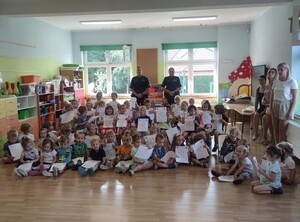 - Spotkanie oświęcimskich policjantów z przedszkolakami z „Bajkowego Dworku” W ramach realizacji akcji prewencyjnej pn. „Bezpieczne Wakacje 2022” policjanci z powiatu oświęcimskiego odwiedzają dzieci korzystające z różnych zorganizowanych form opieki i wypoczynku. Podczas prelekcji przypominają, że warto dobrze, bezpiecznie oraz zdrowo spędzać czas wolny, unikając wypadku lub innych poważnych konsekwencji nieprzemyślanych i niebezpiecznych zabaw.