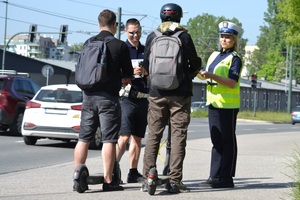 Bezpieczne Wakacje. Policjanci przerwali nastolatkom jazdę po ulicy, na hulajnogach elektrycznych.